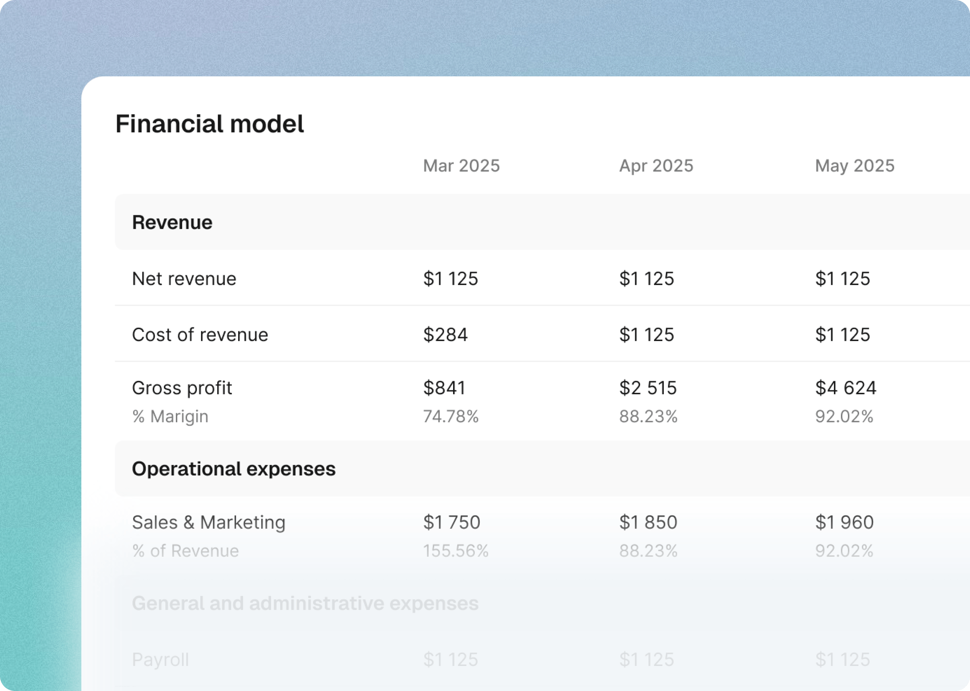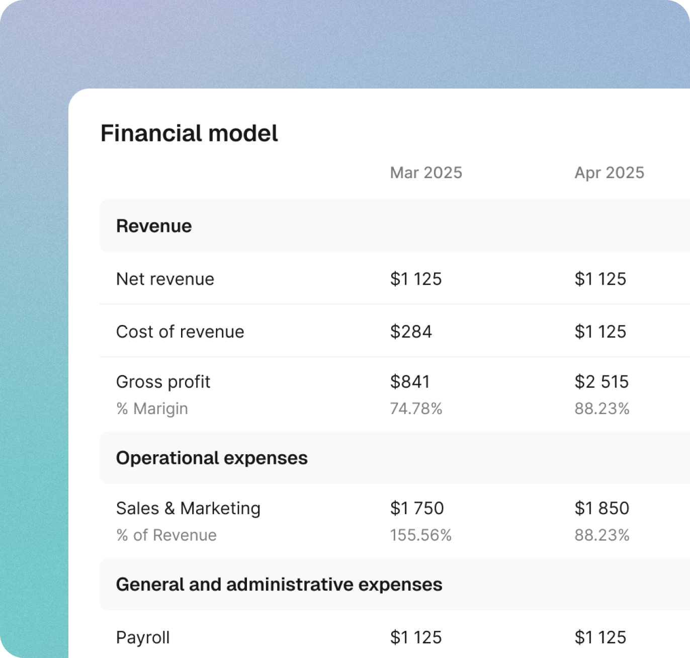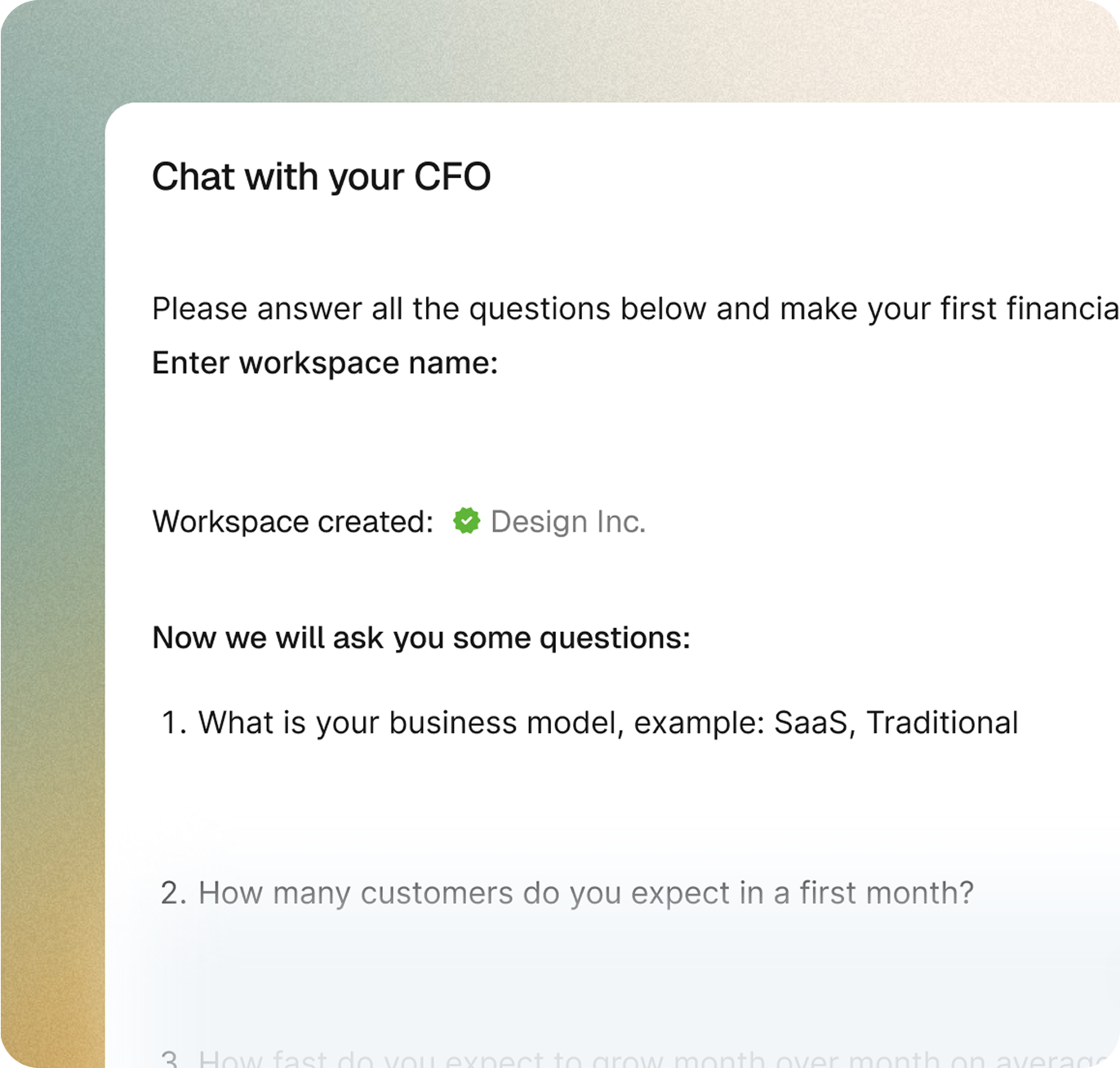 Absolutely! You’ll get 7 free days to build your financial model, explore the dashboard, and try out the AI CFO. A bank card is required, but no charges will be made until the trial ends.
